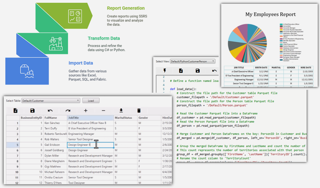# Import the pandas library used for data manipulationimport pandas as pd# Define a function named load_datadef load_data():# Construct file paths for the ACME Customer and Sales tablescustomers_filepath = '/ACME/Customer.parquet'sales_filepath = '/ACME/Sales.parquet'# Read the ACME Customer table from its Parquet filedf_customers = pd.read_parquet(customers_filepath)# Read the ACME Sales table from its Parquet filedf_sales = pd.read_parquet(sales_filepath)# Merge the customer and sales data on the common 'CustomerId' columndf_merged = pd.merge(df_customers, df_sales, on='CustomerId', how='inner')# Convert the 'TotalDue' column to numeric, in case it is stored as a stringdf_merged['TotalDue'] = pd.to_numeric(df_merged['TotalDue'], errors='coerce')# Group by customer information to calculate total sales and order countdf_grouped = df_merged.groupby(['CustomerId', 'FirstName', 'LastName']).agg(TotalSales=('TotalDue', 'sum'), # Sum of TotalDue for each customerOrderCount=('SalesOrderID', 'count') # Count of orders for each customer).reset_index()# Create a full customer name by concatenating FirstName and LastNamedf_grouped['CustomerName'] = df_grouped['FirstName'] + ' ' + df_grouped['LastName']# Sort the customers by TotalSales in descending order to get the highest total sales at the topdf_sorted = df_grouped.sort_values(by='TotalSales', ascending=False)# Select the top 10 customerstop10_customers = df_sorted.head(10)# Select only the desired columns for the final outputresult_df = top10_customers[['CustomerName', 'TotalSales', 'OrderCount']]# Return the resulting DataFramereturn result_df