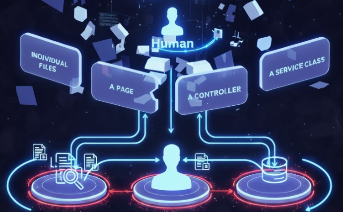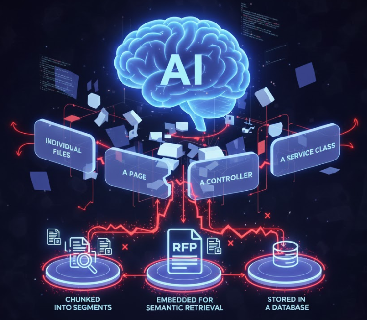When asked to “build a Blazor app that reads RFPs and generates responses,” AI can output individual files, a page, a controller, and a service class.